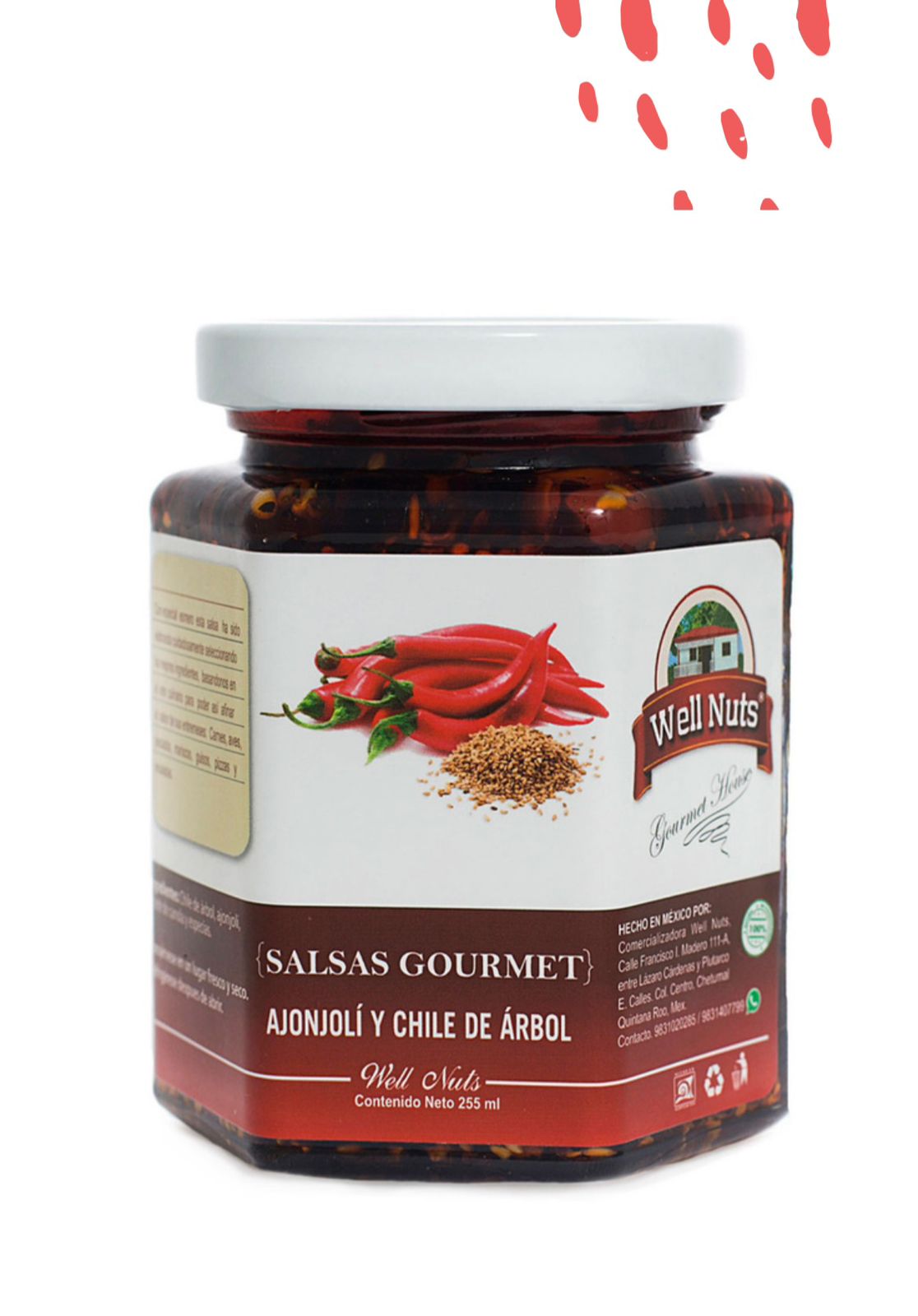 255ml de ajonjolí, chile de árbol y cacahuates. Crujientes cacahuates y ajonjolí forman parte de esta rica salsa macha, pruébala en tacos, tortas, guisados, pastas, pizzas y filetes. Ideal para la comida asiática.