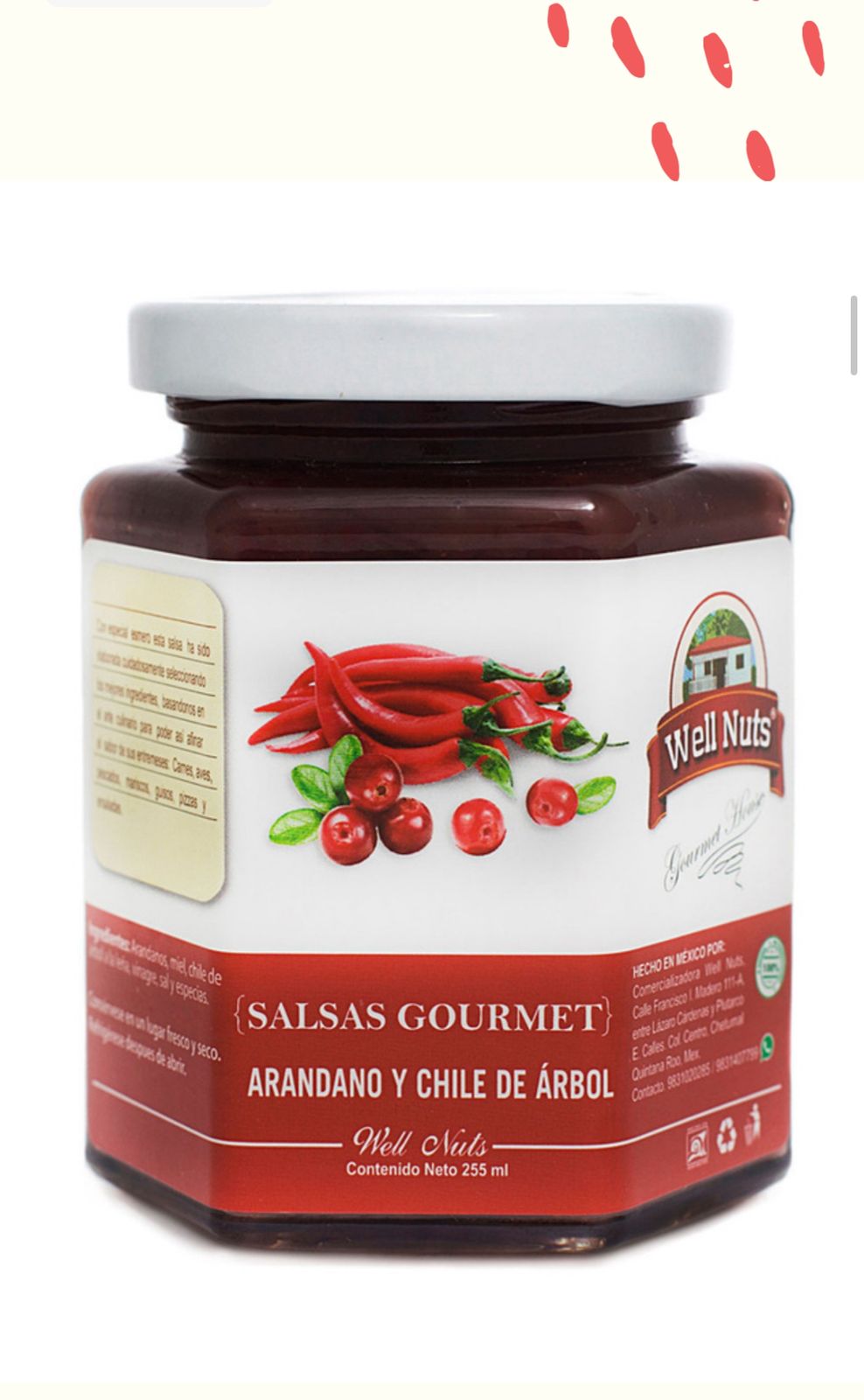 255 ml de arándano y chile de árbol, exquisito Untable de arándanos con chile de árbol y miel de abeja. Para degustar con un Salmon a la plancha, con un pan artesanal, o bien para acompañar una gran variedad de quesos finos.